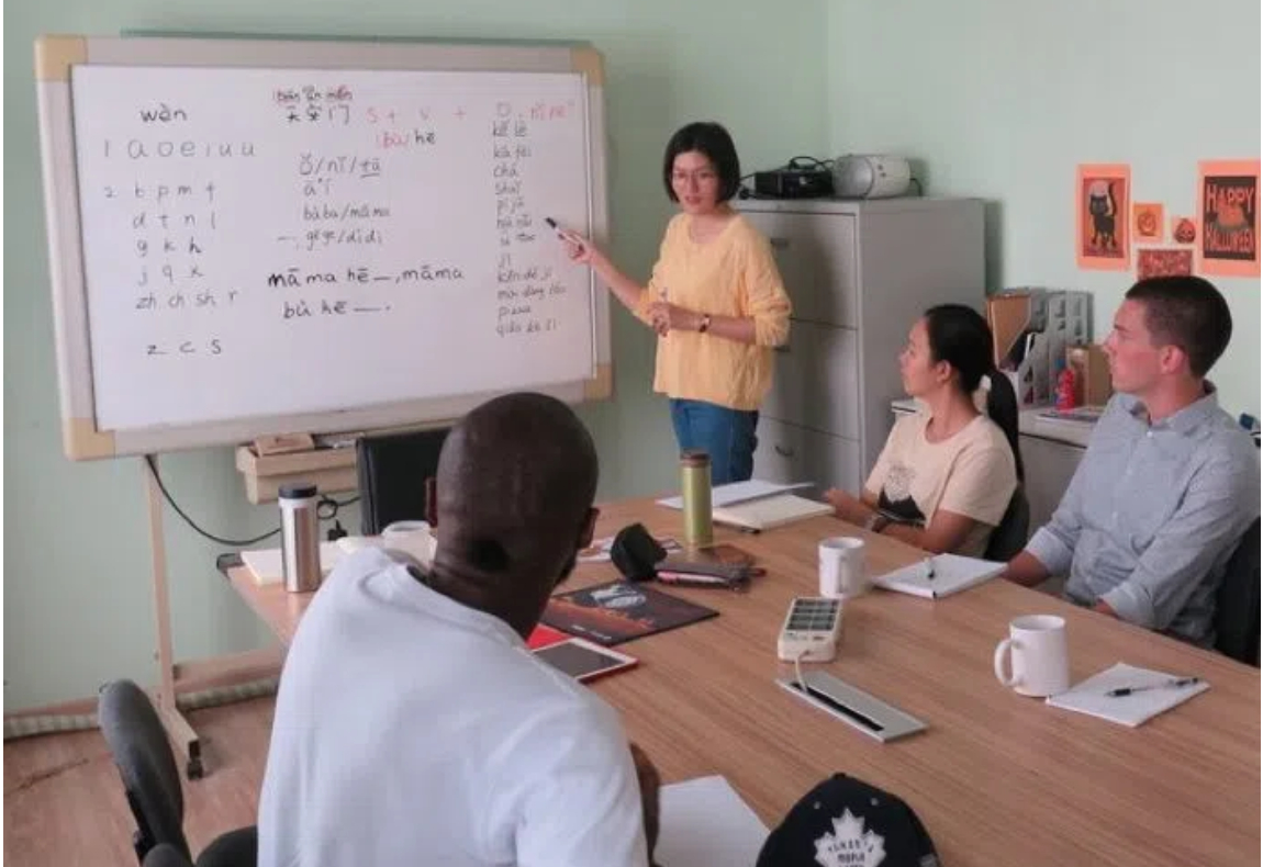 • Classes include listening practice, movie-based learning, and the Chinese Corner, where students engage in informal conversation in a relaxed group setting.